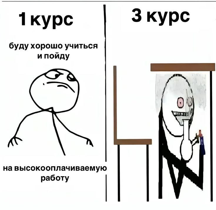 Мем разделён на две части. Слева изображён крупный план «rage face» персонажа, уверенно смотрящего вперёд. Над ним и под ним текст «1 курс: буду хорошо учиться и пойду на высокооплачиваемую работу». Справа изображён тот же персонаж, но уже с безумными глазами и ухмылкой, а над ним и под ним текст «3 курс». Он сидит за столом и держит в руке предмет, похожий на ложку или трубку, а рядом с ним стоит бутылка. Этот мем отражает контраст между ожиданиями и реальностью студенческой жизни, показывая, как первокурсники полны энтузиазма и планов, тогда как к третьему курсу многие сталкиваются с разочарованием, усталостью или изменёнными приоритетами.