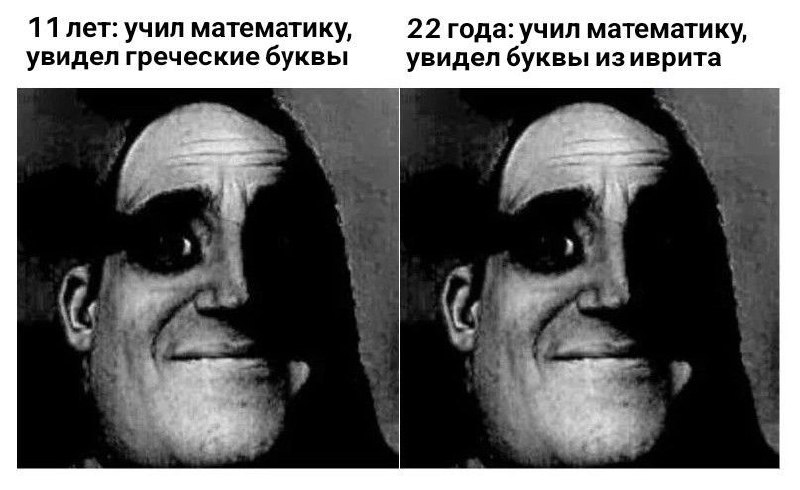 На изображении показано две черно-белые фотографии мужчины с темными тенями на лице, который выглядит обеспокоенным или озадаченным. Слева надпись: «11 лет: учил математику, увидел греческие буквы». Справа: «22 года: учил математику, увидел буквы из иврита». Это демонстрирует усложнение математических обозначений с возрастом и вызывает чувство беспокойства у человека, сталкивающегося с более сложными символами. Когда в 11 лет при изучении математики встречаешь греческие буквы, это уже кажется чем-то сложным, но к 22 годам, когда в той же математике появляются буквы из иврита, уровень сложности и замешательства возрастает еще больше.