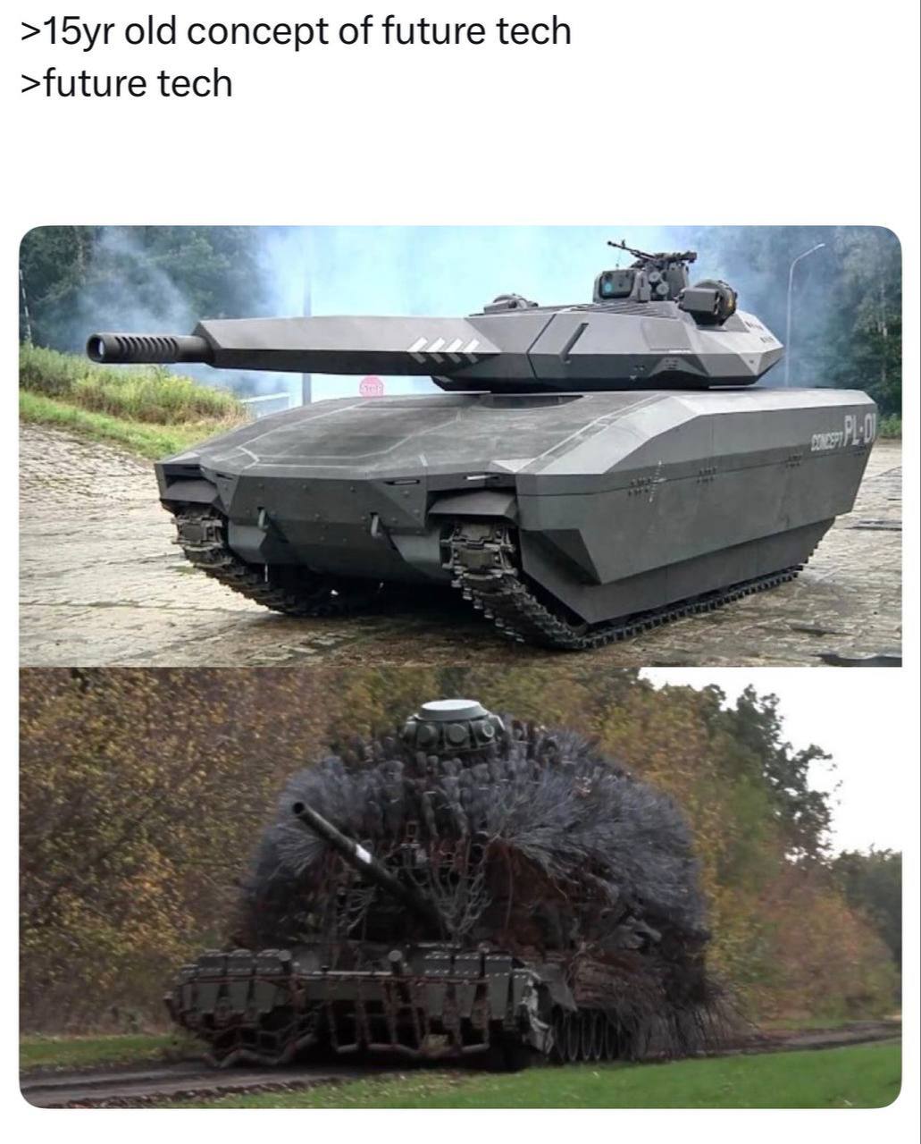 Мем сравнивает представления о будущих технологиях 15-летней давности с реальностью. В верхней части изображения представлен "концепт будущей техники" 15-летней давности – гладкий, футуристичный танк PL-01 Concept в современном дизайне с минималистичными формами и, вероятно, стелс-технологиями. Он выглядит как боевая машина из научно-фантастического фильма. Напротив, в нижней части показана "будущая техника" как она есть – танк, обвешанный камуфляжными сетями и кустарником, чтобы максимально слиться с окружающей средой и избежать обнаружения. Надпись на меме, "15yr old concept of future tech" означает "15-летний концепт будущей техники", а "future tech" – "будущая техника".