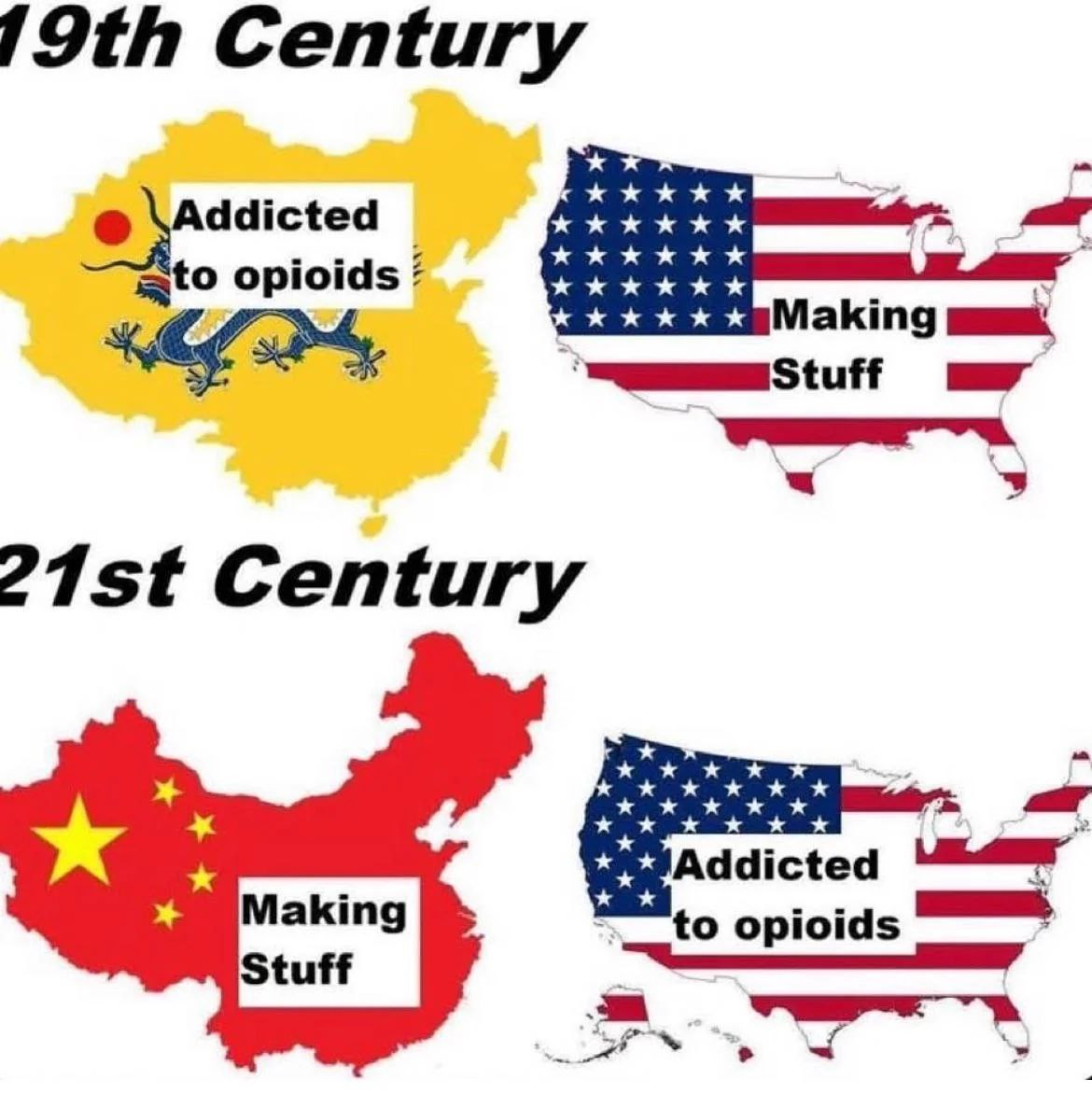 На изображении показано сравнение положения Китая и США в 19-м и 21-м веках. В 19-м веке на карте Китая, окрашенной в жёлтый цвет с изображением дракона, написано «Addicted to opioids» (Подсели на опиоиды), а на карте США, выполненной в цветах американского флага, — «Making Stuff» (Делают вещи). В 21-м веке роли меняются: на карте Китая, окрашенной в красный цвет с жёлтыми звёздами, написано «Making Stuff» (Делают вещи), а на карте США, также в цветах флага, — «Addicted to opioids» (Подсели на опиоиды). Этот мем иллюстрирует историческую и современную ситуацию с опиоидными войнами и производством товаров, указывая на то, как страны поменялись местами в этих аспектах.