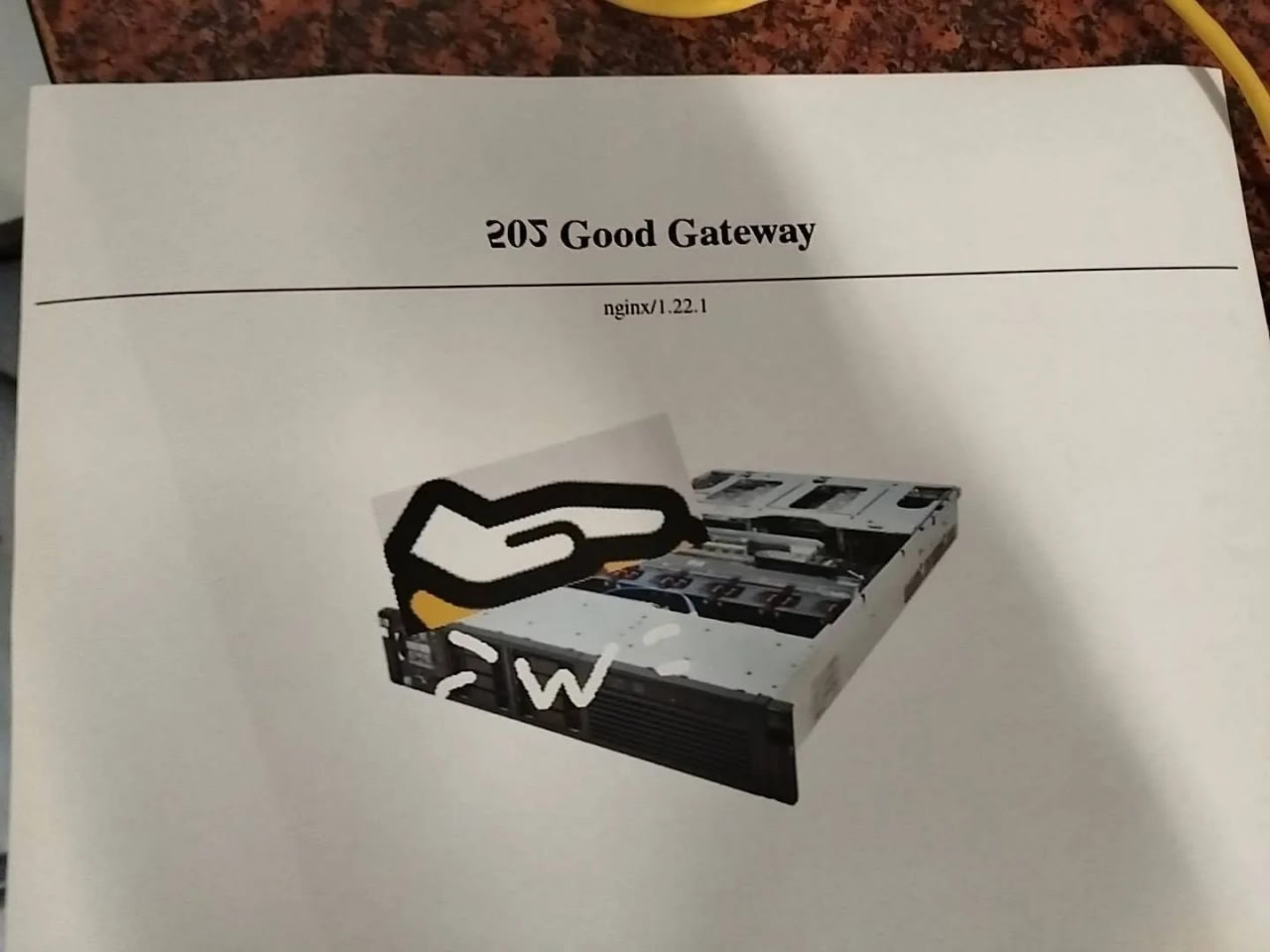 На изображении показан распечатанный лист бумаги, на котором изображен мем с надписью "205 Good Gateway" и "nginx/1.22.1". Ниже на листе изображен серверный корпус без верхней крышки, внутри которого видны платы и компоненты. Поверх серверного корпуса нарисована стилизованная рука, указывающая на него, и какие-то "волны" или "пар" выходят из него. Это забавная интерпретация ошибки "502 Bad Gateway", которая стала "205 Good Gateway", подразумевая, что сервер в хорошем состоянии, что символизируется рукой, которая его одобряет. Возможно, это шутка про идеальный ответ сервера или удачную конфигурацию Nginx.