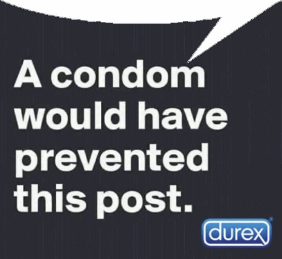 На изображении представлен мем с надписью белым текстом на тёмно-сером фоне, который гласит: "A condom would have prevented this post" (Презерватив предотвратил бы этот пост). Это сообщение заключено в стилизованный диалоговый пузырь, который указывает на что-то невидимое за пределами изображения, предположительно на неудачный или нежелательный пост в социальных сетях. В правом нижнем углу изображения расположен логотип бренда Durex, производителя презервативов, что намекает на саркастическое или юмористическое продвижение их продукции. Мем высмеивает публикации в интернете, которые настолько плохи, что их авторы, возможно, не должны были появиться на свет, или их идеи не должны были быть реализованы.