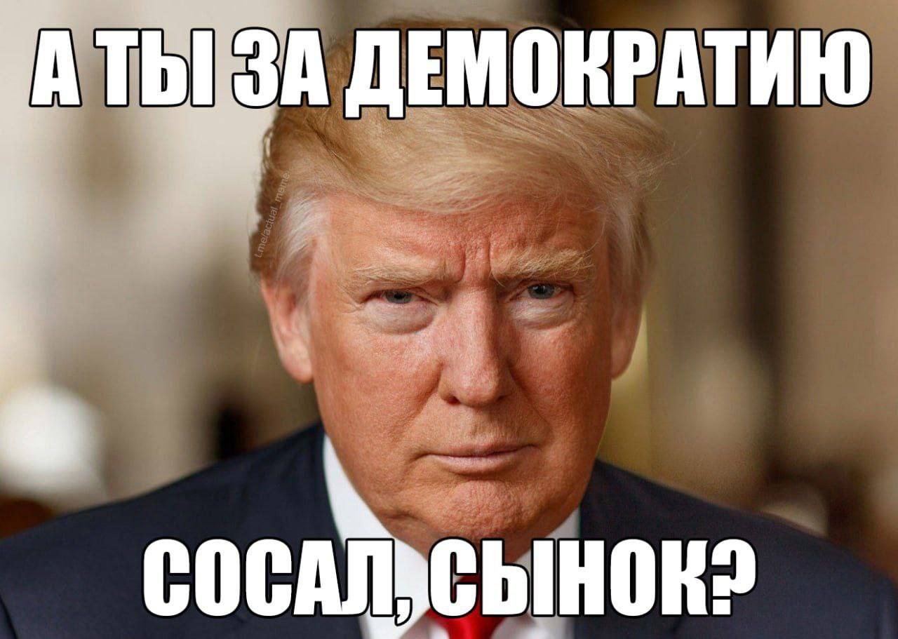 На изображении представлен бывший президент США Дональд Трамп с серьезным выражением лица. Он смотрит прямо на зрителя. Поверх изображения расположены две надписи белым цветом: вверху — "А ТЫ ЗА ДЕМОКРАТИЮ", а внизу — "СОСАЛ, СЫНОК?". Эти фразы, переводимые как "А ты за демократию" и "Сосал, сынок?", создают комический и провокационный контраст, пародируя агрессивный и прямолинейный стиль, часто приписываемый политическим деятелям. Общий вид мема является сатирическим комментарием на политические дискуссии и риторику.