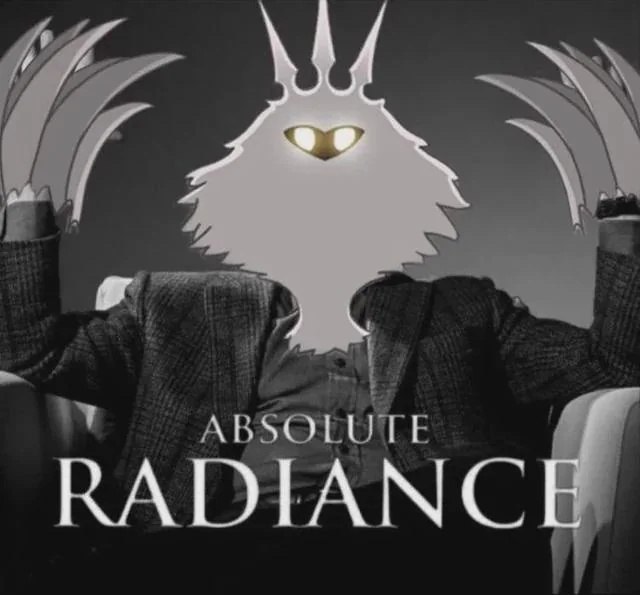 На изображении представлен персонаж Absolute Radiance из игры Hollow Knight, сидящий в кресле. Он одет в деловой костюм, но вместо головы и шеи у него светящийся облик Разума. Руки персонажа подняты вверх, что создает впечатление его величия или торжества. Внизу изображения крупными буквами написано "Absolute Radiance".
