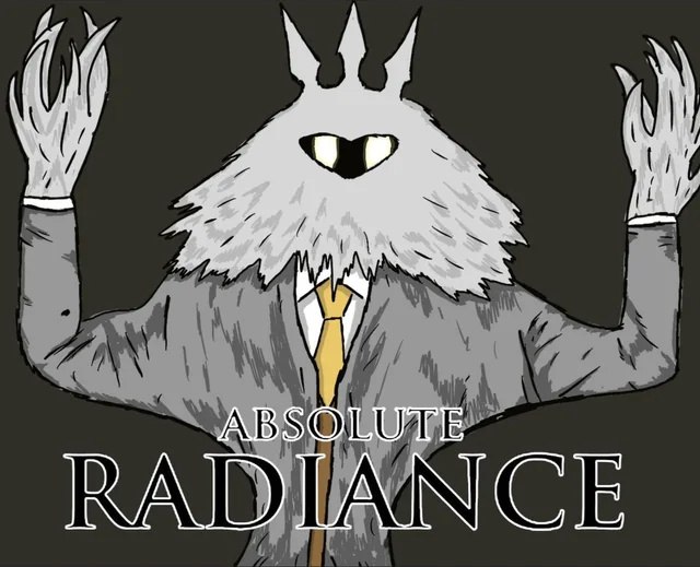 На изображении представлен персонаж из игры Hollow Knight, известный как Абсолютное Сияние (Absolute Radiance), но в необычном деловом образе. Это монстроподобное существо с когтистыми руками, светящимися глазами и серой шерстью, одетое в строгий серый костюм с белой рубашкой и золотым галстуком. Его руки подняты вверх, как будто он призывает или вещает что-то, а на голове виднеется корона. Фон за персонажем однотонный, темный. В нижней части изображения крупными буквами написано "ABSOLUTE RADIANCE".