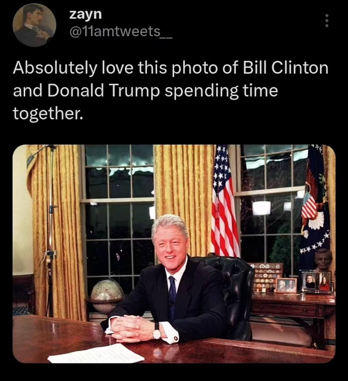 На изображении представлен скриншот твита пользователя zayn (@11amtweets__). В твите написано: "Absolutely love this photo of Bill Clinton and Donald Trump spending time together", что переводится как "Очень нравится это фото Билла Клинтона и Дональда Трампа, проводящих время вместе". Ниже в твите размещена фотография, на которой изображен только Билл Клинтон, сидящий за столом в Овальном кабинете. Он одет в деловой костюм, улыбается и смотрит прямо в камеру. На заднем плане видны окна, занавески, американский флаг и флаг президента США, а также различные предметы интерьера, такие как глобус и рамки для фотографий. Мем основан на ироничном утверждении, что на фотографии присутствуют оба политика, хотя на самом деле показан только один из них. Это создает комический эффект за счет несоответствия между текстом и изображением.