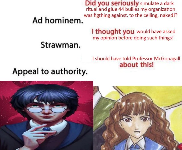 На изображении представлен мем, состоящий из двух частей. В верхней части показаны три логические ошибки: «Ad hominem», «Strawman» и «Appeal to authority», каждая из которых сопровождается репликой. Эти фразы, написанные красным шрифтом, выражают возмущение и недовольство действиями, похожими на те, что мог бы совершить Гарри Поттер, но очень радикальными. В нижней части мема изображены два персонажа, похожие на Гарри Поттера и Гермиону Грейнджер из вселенной Гарри Поттера. Гарри, изображенный с самодовольной улыбкой и жестом, словно что-то объясняет, олицетворяет собой источник проблемы. Гермиона же выглядит крайне недовольной и осуждающей, что соответствует тексту «I should have told Professor McGonagall about this!» («Мне следовало рассказать об этом профессору Макгонагалл!»). Этот мем иронично обыгрывает классические логические ошибки и реакцию на экстравагантные и радикальные поступки, а также характеры персонажей. Возможно, он отсылает к фанфикам или альтернативным сюжетам, где Гарри Поттер проявляет себя не совсем традиционным образом.