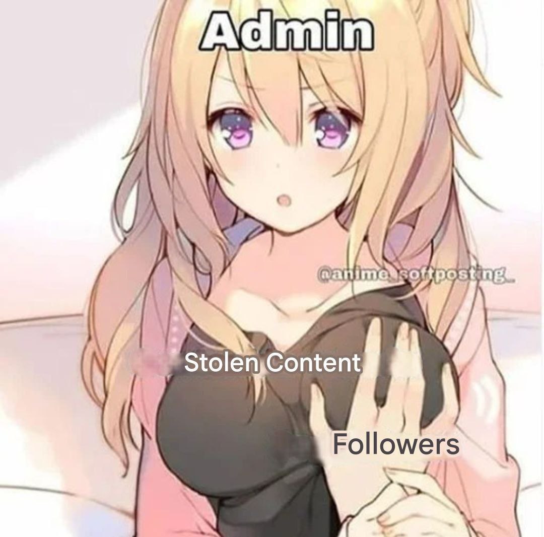На изображении представлено аниме-девушка со светлыми волосами и фиолетовыми глазами, одетая в черную футболку и розовую кофту. Ее руки прижимают грудь. Над ее головой написано «Admin», а на груди — «Stolen Content» и «Followers». Данный мем иллюстрирует ситуацию, когда администраторы сообществ или пабликов используют чужой контент для привлечения подписчиков, что часто встречается в социальных сетях. Таким образом, изображение наглядно показывает, как «ворованный контент» (Stolen Content) помогает «админам» (Admin) получать «подписчиков» (Followers). Этот мем акцентирует внимание на распространенной практике перепоста без указания источника или авторства, подчеркивая ироничность такой стратегии. Он вызывает улыбку у тех, кто знаком с этой проблемой в онлайн-сообществах.