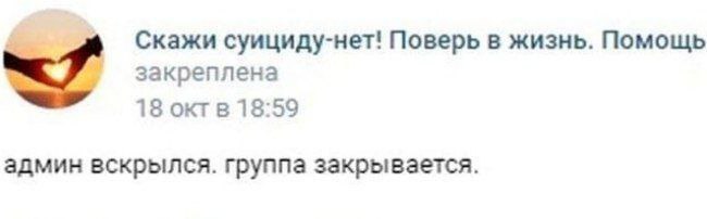 На изображении представлен скриншот из социальной сети, предположительно из группы, посвященной предотвращению суицидов. Верхняя часть сообщения гласит: "Скажи суициду-нет! Поверь в жизнь. Помощь закреплена". Ниже указана дата публикации: "18 окт в 18:59". Однако, центральная часть мема — это продолжение сообщения, которое перечеркивает весь позитивный посыл. В нем говорится: "админ вскрылся. группа закрывается.". Это создает сильный контраст между призывом к жизни и трагической новостью о создателе группы, что и делает изображение мемом.