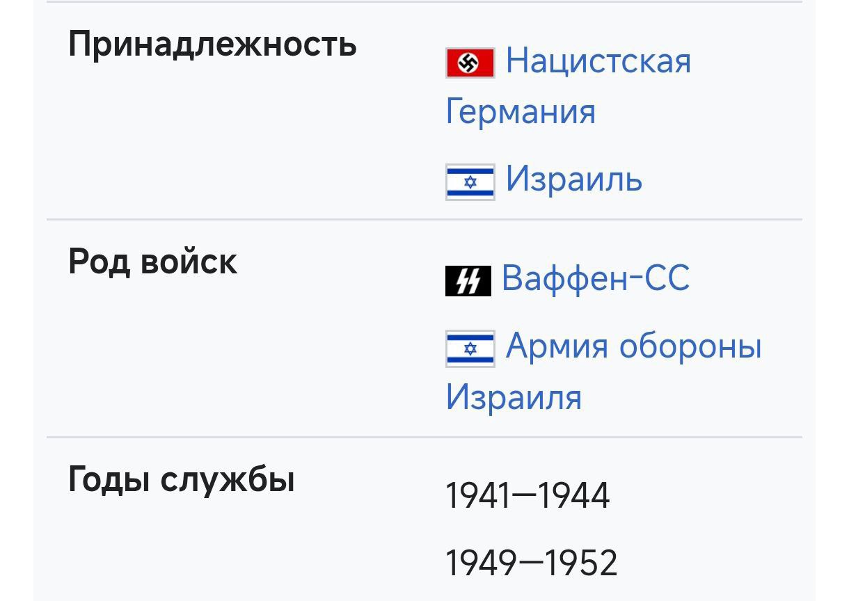 На изображении показан скриншот, предположительно из Википедии или похожего источника, где представлены данные о принадлежности к военным формированиям и годах службы. В первой строке «Принадлежность» указаны «Нацистская Германия» с символом свастики и «Израиль» с символом Звезды Давида. Далее в строке «Род войск» перечислены «Ваффен-СС» и «Армия обороны Израиля». Завершается информация «Годами службы»: 1941–1944 и 1949–1952. Это создает комический эффект из-за крайне контрастных и взаимоисключающих ассоциаций между этими военными структурами. Мем, вероятно, высмеивает ошибки в базах данных или пытается создать парадоксальную ситуацию, когда один и тот же человек или объект мог бы иметь отношение к столь разным и исторически антагонистическим сторонам. Это выглядит как нелепая или абсурдная комбинация, что делает изображение вирусным.