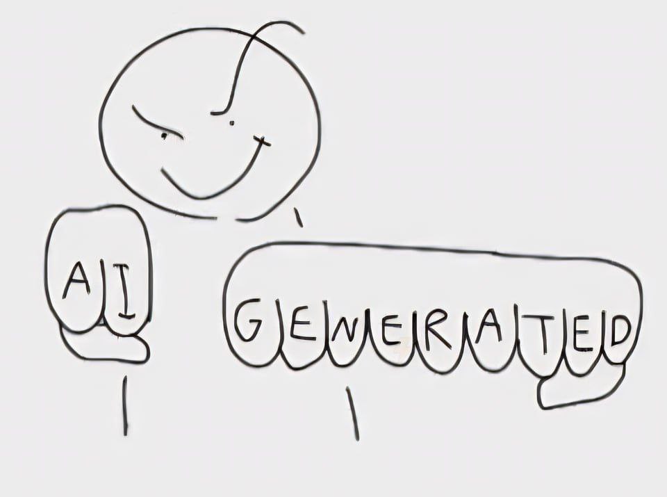 На белом фоне нарисован забавный человечек с хитрой ухмылкой. У него два больших кулака, словно вытатуированных: на левом написано «AI», а на правом — «GENERATED». Это отсылка к изображениям, созданным искусственным интеллектом, которые часто содержат подобные надписи или подписи. Мем, вероятно, высмеивает или подчёркивает вездесущность контента, сгенерированного ИИ, и то, как его легко отличить по некоторым признакам, например, по тексту, написанному на картинке. Или же это просто забавная иллюстрация на тему «AI сгенерировал» (AI GENERATED).