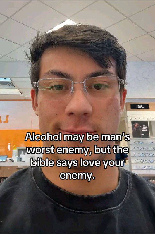 На переднем плане изображен мужчина с короткой прической, в очках и темной футболке. Он смотрит прямо в камеру с легкой ухмылкой или недовольным выражением лица. На фоне видны полки с очками, что может указывать на оптику или магазин аксессуаров. На изображении размещен текст: «Alcohol may be man's worst enemy, but the bible says love your enemy». Что переводится как: «Алкоголь, возможно, худший враг человека, но Библия говорит: люби врага своего». Это создает забавный каламбур, оправдывающий употребление алкоголя.