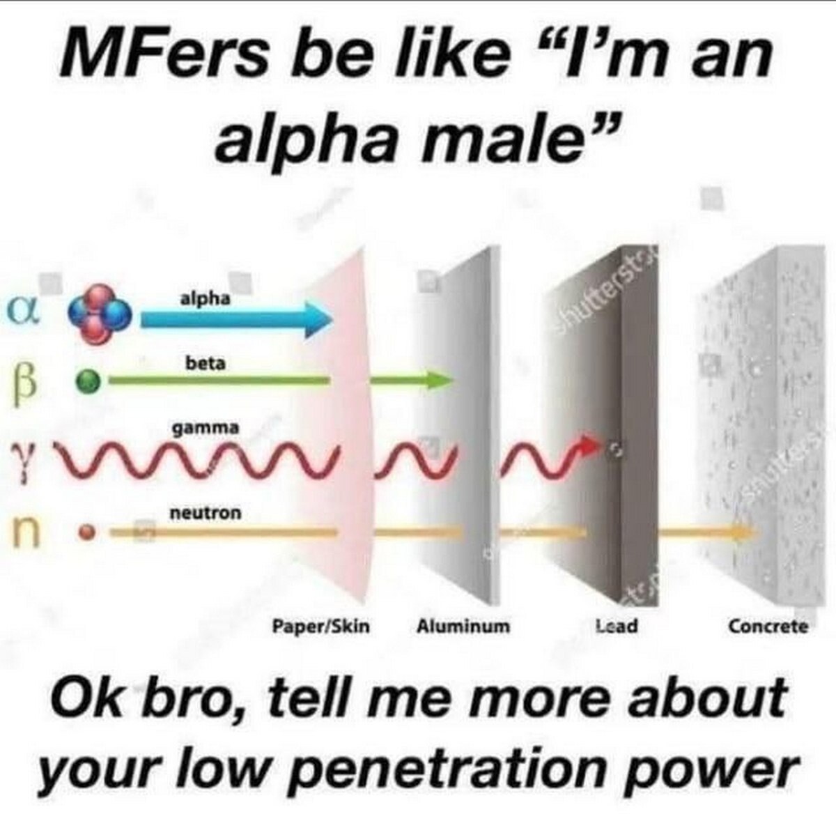 На изображении показана диаграмма, иллюстрирующая проникающую способность различных видов излучения: альфа, бета, гамма и нейтронного. Альфа-излучение блокируется бумагой или кожей, бета-излучение — алюминием, гамма-излучение — свинцом, а нейтронное излучение проходит через все эти материалы и только частично останавливается бетоном. Сверху и снизу от диаграммы расположен текст на английском языке. Сверху написано «MFers be like “I’m an alpha male”» (Чудаки такие: «Я альфа-самец»), а снизу — «Ok bro, tell me more about your low penetration power» (Ладно, братан, расскажи мне побольше о твоей низкой проникающей способности). Мем иронично сравнивает «альфа-самцов» с альфа-излучением, намекая на их низкую «проникающую способность» или влияние.