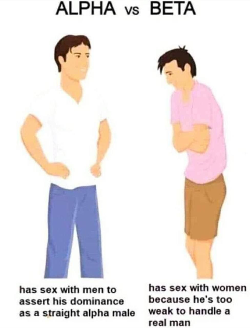 На изображении представлен мем, сравнивающий "альфа" и "бета" мужчин. Слева стоит "альфа" в белой футболке и синих брюках, с руками на бёдрах, с уверенным выражением лица. Под ним написано: "has sex with men to assert his dominance as a straight alpha male" (занимается сексом с мужчинами, чтобы доказать своё доминирование как натуральный альфа-самец). Справа изображён "бета" в розовой футболке и коричневых шортах, ссутулившись и скрестив руки на груди, выглядя менее уверенным. Под ним текст гласит: "has sex with women because he's too weak to handle a real man" (занимается сексом с женщинами, потому что слишком слаб, чтобы справиться с настоящим мужчиной). Мем переворачивает типичные представления об "альфа" и "бета" мужчинах, используя гомоэротический юмор для создания иронического эффекта.