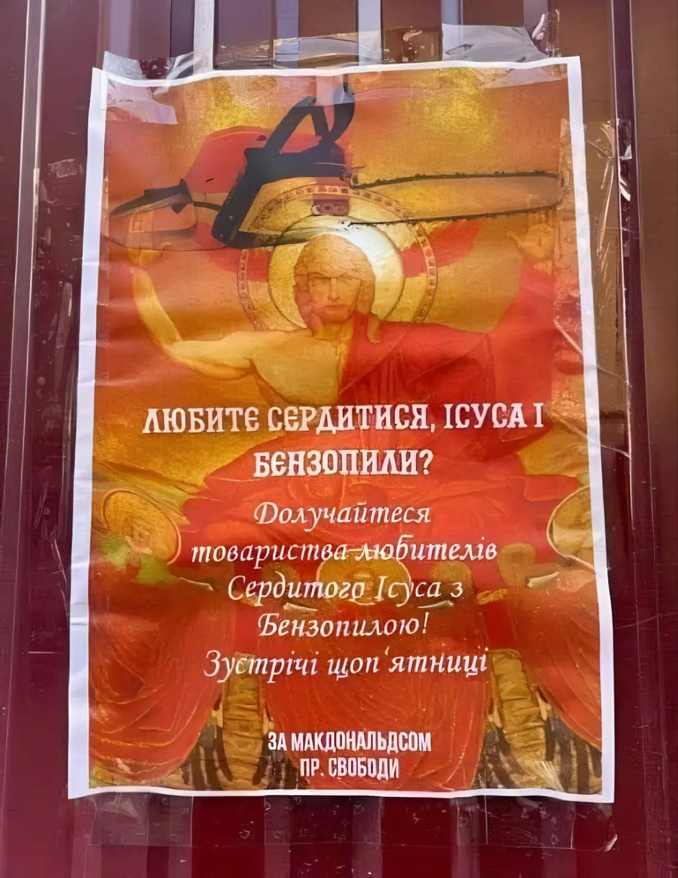 На изображении представлено объявление, приклеенное на металлическую поверхность. Основной фон объявления представляет собой стилизованное изображение, напоминающее икону, на которой изображен Иисус Христос с нимбом над головой, но с необычной деталью — за ним видна бензопила. Цветовая гамма изображения варьируется от золотисто-желтых до красно-оранжевых оттенков.В верхней части объявления крупным шрифтом набран вопрос: «Любите сердиться, Иисуса и бензопилы?» (В оригинале: "Любите сердиться, Исуса і бензопили?"). Ниже следует призыв: «Присоединяйтесь к обществу любителей Сердитого Иисуса с бензопилой!» (В оригинале: "Долучайтеся товариства любителів Сердитого Ісуса з Бензопилою!"). Далее указано: «Встречи каждую пятницу» (В оригинале: "Зустрічі щоп'ятниці"), а в самом низу уточняется место встречи: «За Макдональдсом, пр. Свободы» (В оригинале: "За Макдональдсом пр. Свободи").
