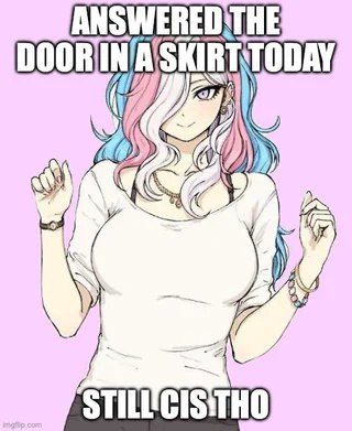 На изображении показана девушка в аниме-стиле с длинными волнистыми волосами, окрашенными в розовый, белый и голубой цвета. У нее большие, фиолетовые глаза и легкая улыбка на лице. Девушка одета в белую кофту с длинными рукавами и черные бретельки, также на ней видны украшения: золотое ожерелье на шее, часы на левом запястье и браслеты на правом. На меме присутствует текст "ANSWERED THE DOOR IN A SKIRT TODAY" (Открыла дверь в юбке сегодня) и "STILL CIS THO" (Но все еще цис).