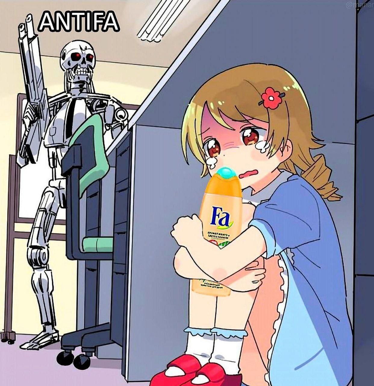 На изображении показана плачущая аниме-девочка, которая в испуге сидит на полу и обнимает бутылку геля для душа Fa. Сзади из-за офисной перегородки на неё смотрит Терминатор с винтовкой в руке, а над ним написано слово "ANTIFA". Девочка, судя по всему, боится приближающегося Терминатора. Этот мем обычно используется для иллюстрации страха перед "антифашистами" или радикальными левыми активистами, при этом Fa (ФА) является сокращением от "фашистов".