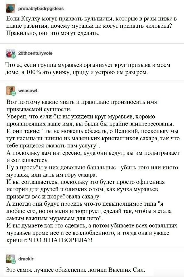 На изображении представлен скриншот из Tumblr с перепиской нескольких пользователей. Обсуждение начинается с шутливого вопроса о том, почему муравьи не могут призывать человека, если культисты могут призывать Ктулху. Далее пользователь описывает гипотетическую ситуацию, в которой муравьи организуют ритуал призыва, используя ваше имя и предлагая сделку, например, линию из кристаллов сахара. В итоге человек соглашается на их простые просьбы (убить другого муравья или дать гору сахара), но затем муравьи просят "невыполнимое" (сделать одного муравья самым важным), что приводит к жестокому финалу, где человек убивает всех, кроме избранной пары, а она в ужасе кричит "Что я натворила?!" Последний комментарий гласит: "Это самое лучшее объяснение логики Высших Сил".
