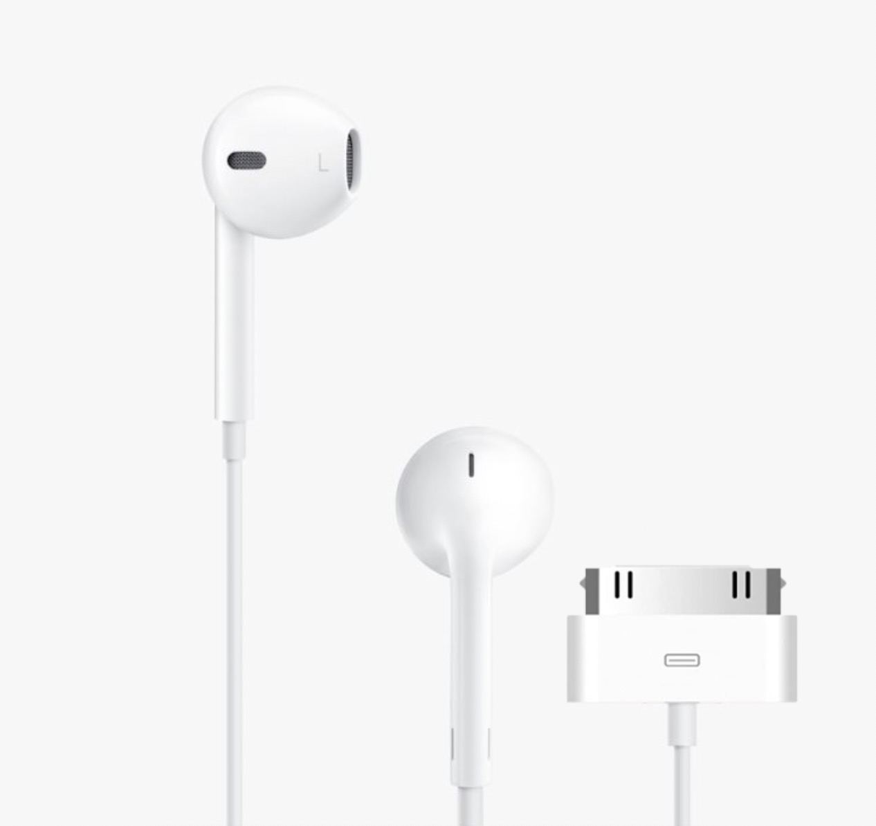 На изображении показаны белые проводные наушники Apple EarPods с 30-контактным разъемом. Эти наушники были популярны с более ранними моделями iPhone и iPod. На переднем плане расположен правый наушник с отверстием для микрофона, а левый наушник находится чуть выше и левее. Справа внизу виден белый штекер, который предназначен для подключения к порту старых устройств Apple. Общий фон изображения белый, что позволяет четко выделить наушники. Наушники имеют характерный дизайн Apple с гладкими округлыми формами и минималистичным видом. Детально прорисованы отверстия для динамиков и другие элементы конструкции.