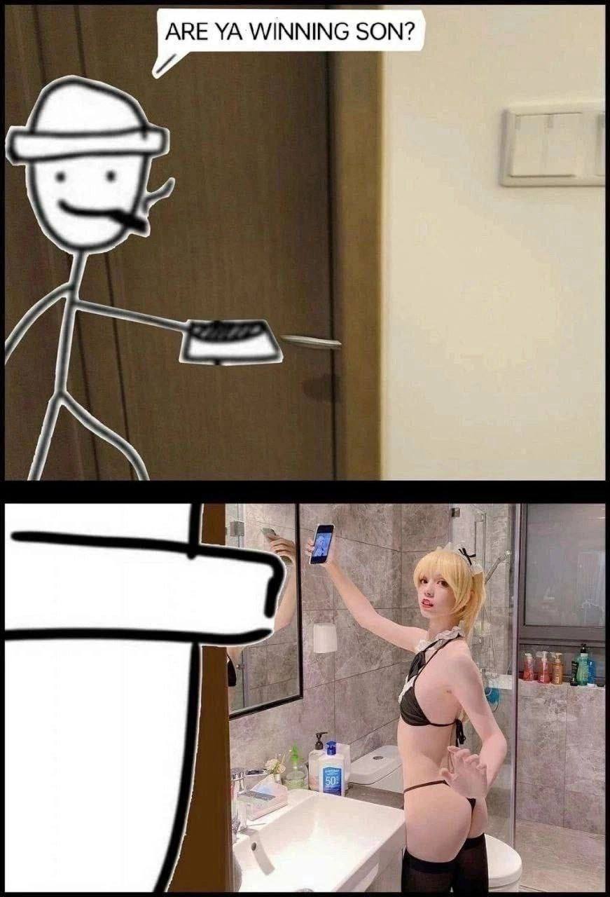 Мем состоит из двух частей. В верхней части изображен нарисованный человечек с усами, сигарой в зубах и в шляпе, который заглядывает в дверь и спрашивает: "Are ya winning son?" (Ты побеждаешь, сынок?). Человечек смотрит сверху вниз, поэтому очевидно, что действие происходит в реальной жизни. Сын снимает себя в зеркало в костюме горничной: он надел парик, черный топ-бикини с рюшами и черные стринги, чулки и выглядит как женщина. На переднем плане раковина с мылом и полотенцем, а также зеркало, где видно отражение сына, делающего селфи. Его рот приоткрыт, и кажется, что он находится в замешательстве или шоке, что его застали за таким занятием.