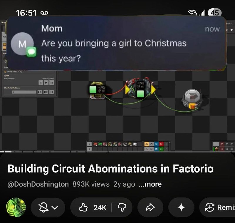 Мем изображает экран телефона или компьютера, на котором открыто видео с YouTube под названием "Building Circuit Abominations in Factorio" (Строительство схемных мерзостей в Factorio). В верхней части экрана появляется уведомление от "Mom" (Мамы) с вопросом: "Are you bringing a girl to Christmas this year?" (Ты приведешь девушку на Рождество в этом году?). Этот мем является юмористическим сопоставлением между увлечением сложными техническими задачами в игре и отсутствием личной жизни, а именно девушки, которое подразумевается вопросом матери. На экране игры Factorio видны различные блоки и соединения, намекающие на сложность игрового процесса.