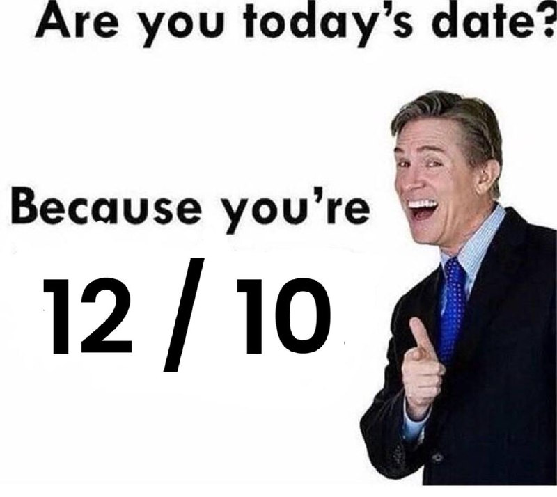 На картинке изображен мужчина средних лет в строгом костюме и синем галстуке, который широко улыбается и делает жест большим пальцем вверх, указывая на надпись рядом с ним. Текст на меме гласит: "Are you today's date? Because you're 12/10", что переводится как "Ты сегодняшняя дата? Потому что ты 12/10". Эта фраза обыгрывает созвучие "date" (дата) и "date" (свидание), а также показывает оценку "12 из 10", что означает очень высокую степень привлекательности. Мем используется для комплиментов или просто для выражения одобрения, когда что-то или кто-то выглядит исключительно хорошо. Улыбающийся мужчина с жестом "отлично" усиливает положительное значение послания. Изображение и текст на нем создают легкую, юмористическую атмосферу.