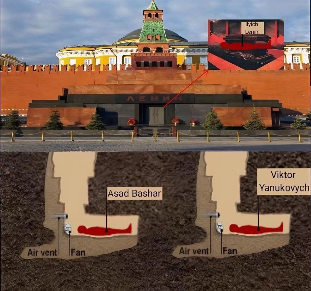 На картинке изображен мавзолей Ленина, разделенный на несколько частей. Первая часть показывает саркофаг с надписью «Ilyich Lenin». Ниже изображены две подземные комнаты, в которых находятся тела Асада Башара и Виктора Януковича. В каждой комнате есть вентиляционная шахта и вентилятор для поддержания необходимой температуры и влажности. Создатели мема, вероятно, хотели пошутить, представив, что в мавзолее, кроме Ленина, хранятся тела других известных политиков.