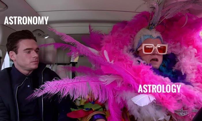 Мем изображает сравнение между двумя схожими по звучанию, но разными по сути понятиями: астрономией и астрологией. На левой части изображения запечатлен Ричард Мэдден, который сидит в машине, одетый в темную рубашку, с серьезным и сосредоточенным выражением лица. Над ним висит надпись "ASTRONOMY". На правой части, в той же машине, находится человек в экстравагантном, ярком костюме, украшенном множеством розовых перьев, с огромными белыми очками и выражением легкого удивления или испуга. Этот образ соответствует надписи "ASTROLOGY". Мем наглядно демонстрирует контраст между строгой наукой (астрономией) и псевдонаукой (астрологией), используя визуальные метафоры: серьезность и сдержанность против яркости, театральности и возможно, нелепости. Надписи на меме гласят: "ASTRONOMY" (Астрономия) и "ASTROLOGY" (Астрология), что четко указывает на предмет сравнения.