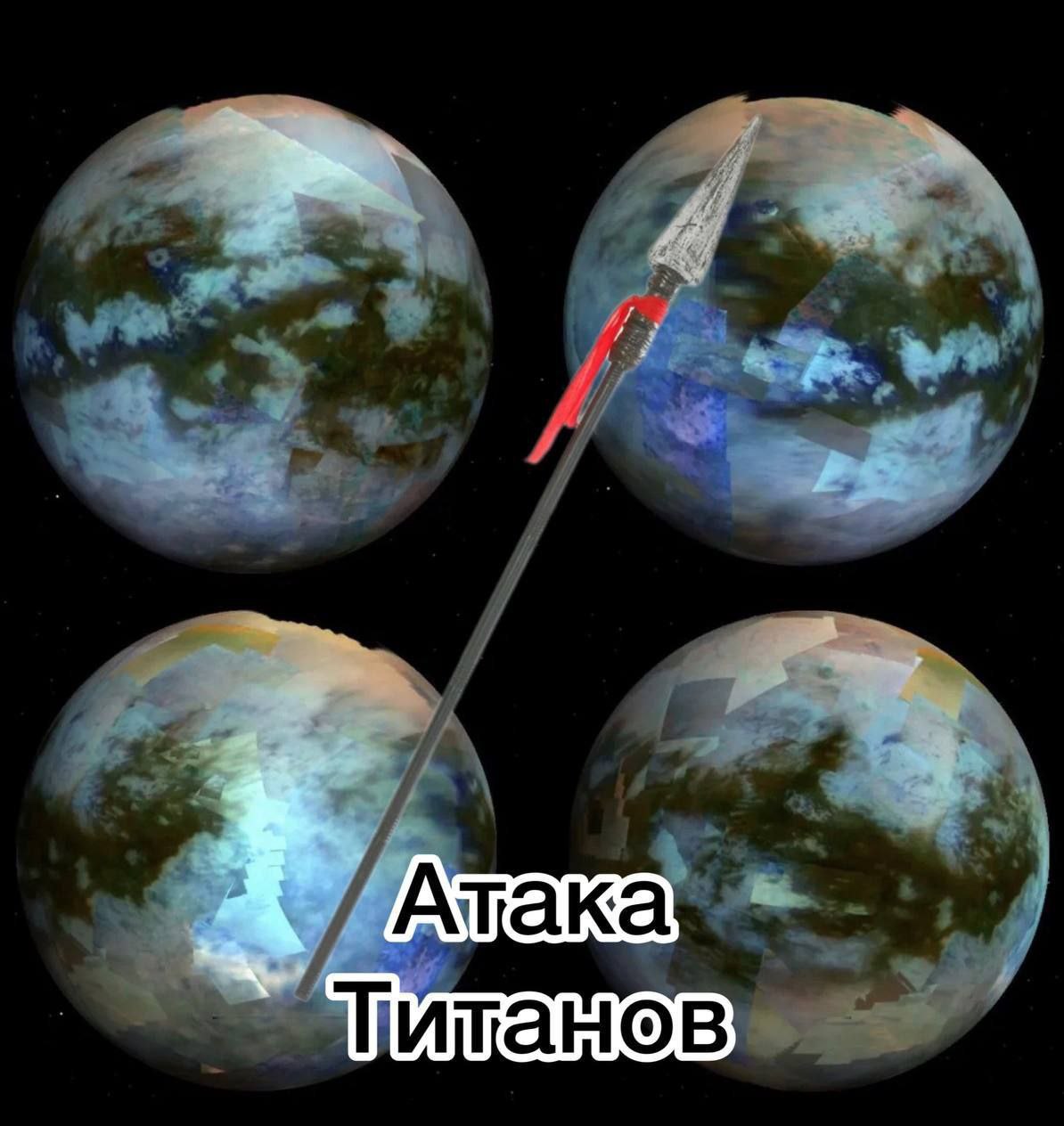 На изображении показано четыре планеты, предположительно Титаны, расположенные на черном фоне, имитирующем космическое пространство. Через центр изображения по диагонали проходит древковое оружие, похожее на копье или пику, с острым наконечником и красной повязкой у основания острия. Текст на изображении гласит "Атака Титанов", что является отсылкой к популярному аниме и манге "Attack on Titan".