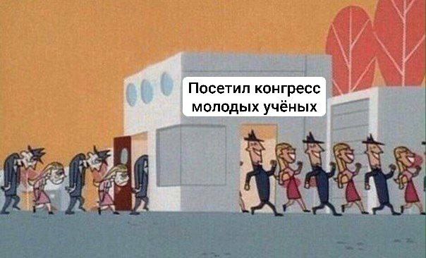 На изображении показана группа людей, заходящих в здание с одной стороны и выходящих с другой, преображаясь в процессе. С левой стороны в здание заходят люди с грустными, опущенными лицами, в изношенной одежде и сгорбленной осанкой, они выглядят уставшими и подавленными. С правой стороны из здания выходят те же самые люди, но уже с широкими улыбками, бодрой походкой и расправленными плечами, их внешний вид значительно улучшился. Над зданием находится надпись: "Посетил конгресс молодых учёных", что означает, что они посетили конгресс молодых ученых. Мем в ироничной форме показывает, как посещение конгресса молодых ученых может преобразить человека, делая его счастливым и полным энтузиазма.