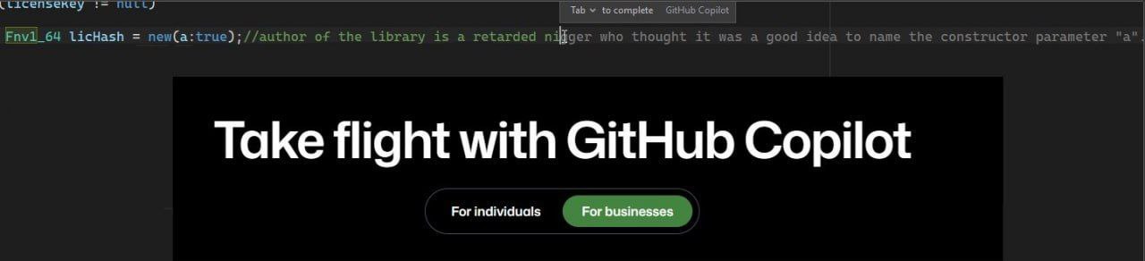 На изображении показан скриншот экрана монитора с открытым редактором кода. В верхней части экрана виден комментарий к коду, в котором автор библиотеки назван «умственно отсталым ниггером», придумавшим назвать параметр конструктора «а». Под этим комментарием расположено рекламное объявление GitHub Copilot с заголовком «Take flight with GitHub Copilot» («Взлетай с GitHub Copilot») и двумя кнопками: «For individuals» («Для частных лиц») и «For businesses» («Для бизнеса»). Таким образом, мем создает юмористический контраст между оскорбительным комментарием в коде и вдохновляющим рекламным слоганом.