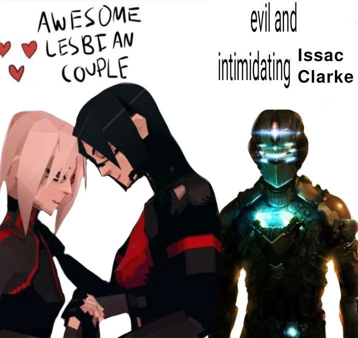 На изображении показана комбинация двух контрастных элементов: слева нарисованные в аниме-стиле две девушки нежно обнимаются, а над ними подпись “Awesome lesbian couple” (Потрясающая лесбийская пара). Девушки выглядят счастливыми и влюбленными, с розовыми сердечками, парящими вокруг них. Справа от них изображен персонаж Айзек Кларк из игры Dead Space, одетый в свой характерный боевой костюм, который светится голубым светом. Над ним находится подпись “evil and intimidating Issac Clarke” (злой и устрашающий Айзек Кларк). Этот мем создает забавный контраст между милой и романтичной сценой и брутальным персонажем из хоррор-игры, подчеркивая их совершенно разные настроения и образы.