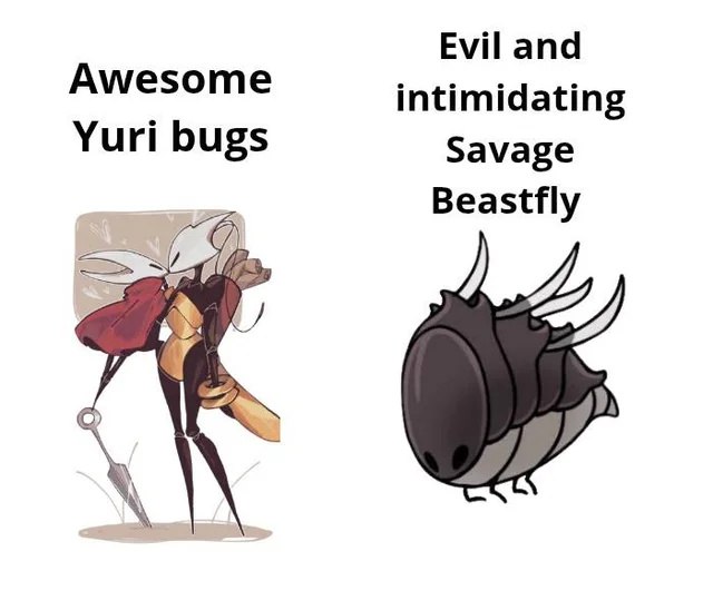Мем делится на две части: в левой изображены два женских персонажа из игры Hollow Knight, обнимающие друг друга, под текстом "Awesome Yuri bugs". Правая часть содержит изображение враждебного насекомого из той же игры под текстом "Evil and intimidating Savage Beastfly". Мем сравнивает привлекательность и милоту персонажей, ассоциируемых с юри-отношениями, с "ужасным" видом обычного игрового врага, показывая иронию восприятия. На картинке видно, как один персонаж в красной накидке прижимается к другому, держащему острое оружие, а справа изображена толстая фиолетовая гусеница с шипами.