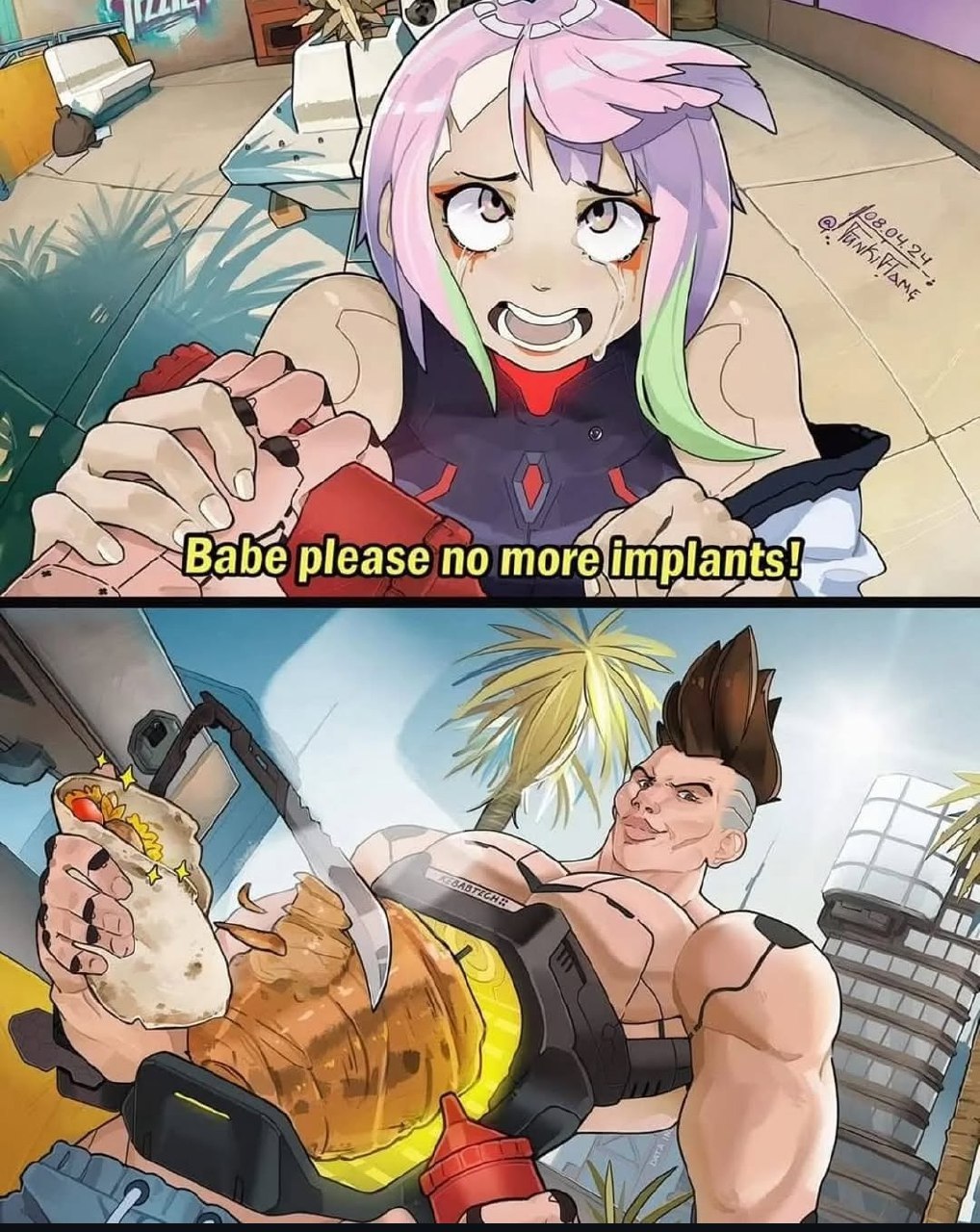 Мем состоит из двух панелей. На верхней панели Люси из Cyberpunk: Edgerunners со слезами на глазах умоляет: "Babe please no more implants!" (Дорогой, пожалуйста, хватит имплантов!). На нижней панели Дэвид из того же аниме изображен с накачанным телом, лежащим на пляже, он ест шаурму или большой кебаб, выглядя очень довольным. Его тело выглядит так, будто он сделал много имплантов, но он наслаждается едой.