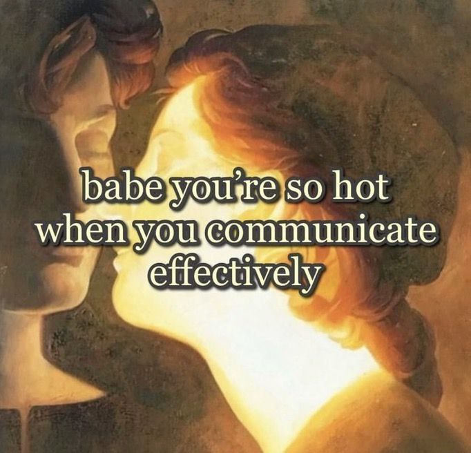 На картинке изображен фрагмент старинной картины, вероятно, эпохи Возрождения или барокко. Видно двух человек, чьи головы находятся близко друг к другу, создавая впечатление интимного момента или глубокого диалога. Правая фигура озарена ярким золотистым светом, который делает ее контуры нежными и светящимися, в то время как левая фигура остается в тени. Возможно, это аллегория или мифологический сюжет, но на фоне изображения размещен текст на английском языке: "Babe you're so hot when you communicate effectively" (Крошка, ты такая горячая, когда эффективно общаешься). Надпись на английском языке "Babe you're so hot when you communicate effectively" является ключевым элементом мема, добавляющим юмористический и современный контекст к классическому изображению. Она создает забавный контраст между серьезным и возвышенным стилем живописи и повседневной, слегка флиртующей фразой, подчеркивающей важность хорошей коммуникации в отношениях. Эта фраза может быть использована как ироничный комментарий о том, что привлекательность человека значительно возрастает, когда он умеет четко и ясно выражать свои мысли.