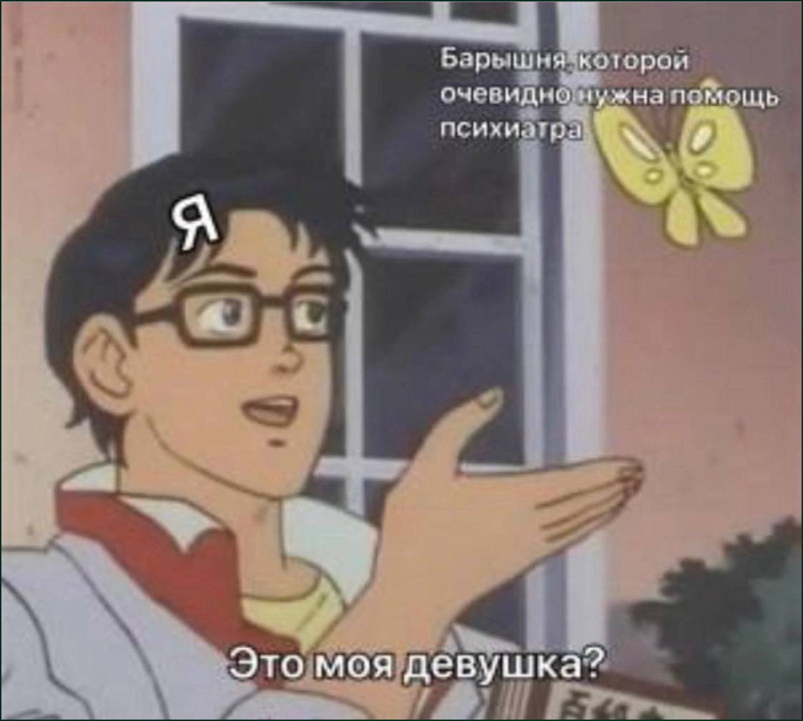 Мем изображает кадр из аниме, где персонаж в очках делает жест рукой, словно указывает на что-то. Над его головой парит бабочка. Текст мема гласит: Я: Барышня, которой очевидно нужна помощь психиатра. Это моя девушка? Смысл мема заключается в том, что человек, который задаёт вопрос, игнорирует очевидные проблемы и особенности своей девушки, предпочитая видеть в ней идеал, несмотря на явные признаки того, что ей нужна помощь специалиста.