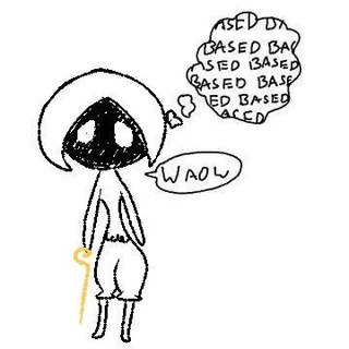 На изображении нарисован маленький человечек в белом одеянии, с капюшоном и черным лицом, напоминающим дыру. В правой руке он держит тонкую желтую трость. Над головой персонажа расположен пузырь мысли, заполненный повторяющимся словом «based». Рядом с ним, в пузыре речи, написано слово «waow». Этот мем выражает удивление или восхищение чем-либо, что можно охарактеризовать как «based», что означает что-то крутое, оригинальное или соответствующее собственным принципам, даже если это не общепринято.