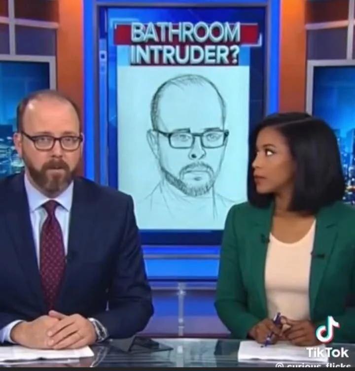 На изображении показаны двое ведущих новостей, мужчина и женщина, сидящие за столом в студии. Мужчина в костюме и очках, с бородой, смотрит прямо на камеру. Женщина в зеленом пиджаке и бежевой футболке, с короткой прической, повернула голову вправо и смотрит на своего соведущего. На большом экране за их спинами демонстрируется рисунок, похожий на карандашный портрет мужчины с бородой и в очках, который очень похож на мужчину-ведущего. Над рисунком видна надпись «BATHROOM INTRUDER?», что в переводе на русский язык означает «ВТОРЖЕНЕЦ В ВАННУЮ?».