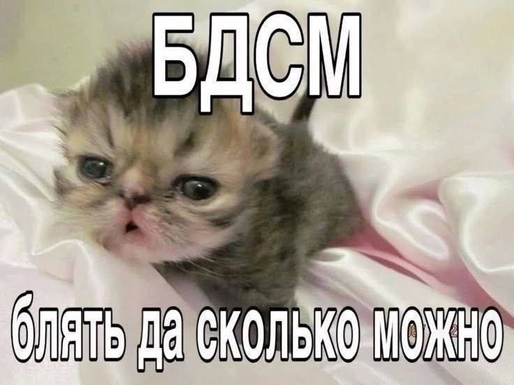 На изображении представлен маленький пушистый котенок с большими глазами, лежащий на белой шелковой ткани. Сверху надпись "БДСМ", а снизу "блять да сколько можно". В русском переводе "блять да сколько можно" означает "блядь да сколько можно" или "сука, сколько можно", выражая сильное недовольство или усталость. Котенок выглядит очень милым, но выражение его "лица" и текст на картинке создают комичный контраст. Изображение явно передает состояние утомления или раздражения, несмотря на безобидный вид животного.
