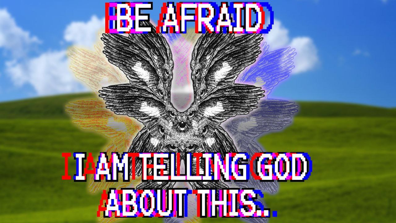Мем изображает библейского серафима с шестью крыльями, четырьмя из которых видны, и множеством глаз, расположенных на крыльях и теле. Серафим изображен в черно-белых тонах, с эффектом свечения в фиолетовых и оранжевых оттенках, на фоне "безмятежного" пейзажа, напоминающего стандартные обои Windows XP "Bliss" - зеленое поле и голубое небо с облаками. Сверху и снизу на изображении расположен текст "BE AFRAID I AM TELLING GOD ABOUT THIS.", выполненный в пиксельном стиле с эффектом VHS-помех, который переводится как "БОЙСЯ, Я РАССКАЖУ БОГУ ОБ ЭТОМ." Этот мем часто используется для выражения тревоги, удивления или недовольства по поводу чего-либо, что кажется настолько возмутительным или необычным, что требует вмешательства высших сил. Он может также высмеивать чрезмерную реакцию на незначительные события или использоваться для создания атмосферы абсурдного юмора, когда нечто пугающее и сверхъестественное появляется в обыденной обстановке.