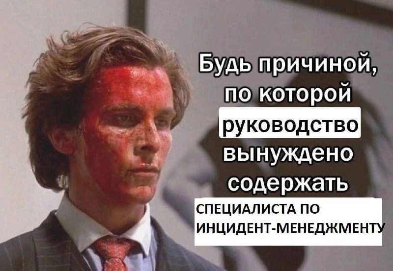 На изображении представлен кадр из фильма "Американский психопат", где на лице главного героя, Патрика Бэйтмана, видны брызги крови. Он одет в деловой костюм: рубашка, галстук и пиджак в тонкую полоску. Выражение его лица сосредоточенное и немного отстраненное. Рядом с ним на белом фоне расположен текст черного цвета, который гласит: "Будь причиной, по которой руководство вынуждено содержать специалиста по инцидент-менеджменту". Это ироничный призыв к тому, чтобы быть настолько проблемным сотрудником, чтобы компания была вынуждена нанимать отдельного специалиста для урегулирования инцидентов, вызванных вами.