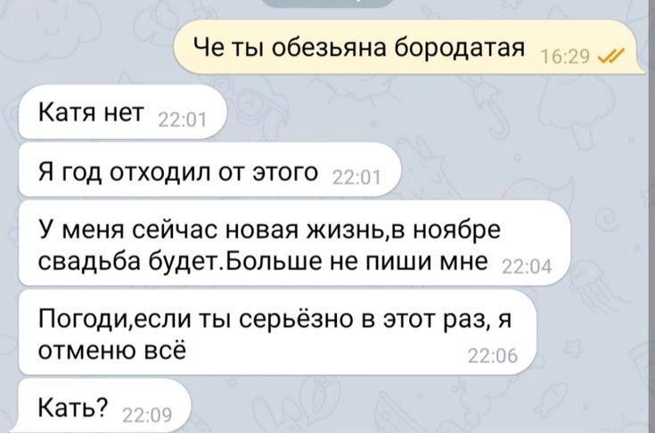 Че ты обезьяна бородатая. Катя нет. Я год отходил от этого. У меня сейчас новая жизнь, в ноябре свадьба будет. Больше не пиши мне. Погоди, если ты серьёзно в этот раз, я отменю всё. Кать?