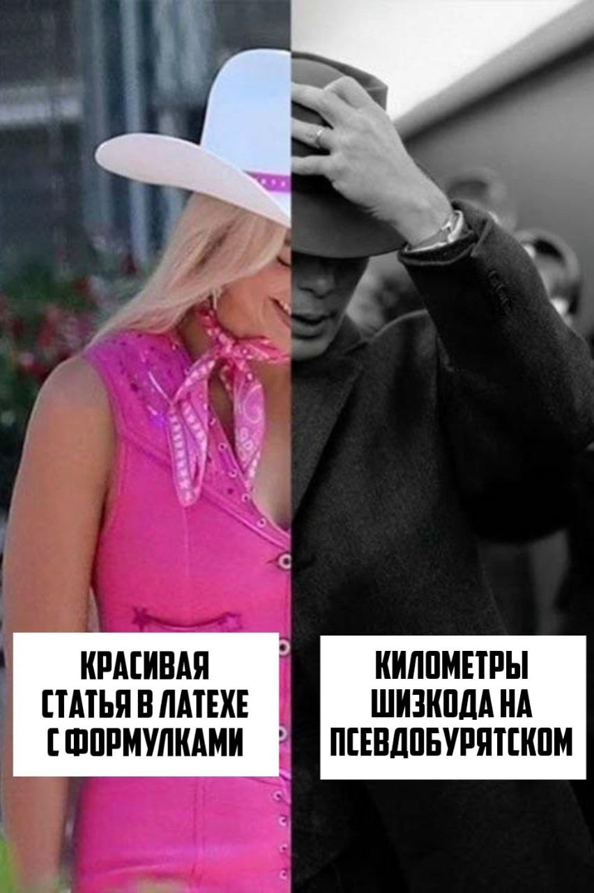 Мем разделён на две части. Слева изображена Марго Робби в образе Барби из одноимённого фильма: она улыбается, на ней розовая безрукавка, розовый шейный платок и белая ковбойская шляпа с розовой лентой. Под ней белая надпись: «КРАСИВАЯ СТАТЬЯ В ЛАТЕХЕ С ФОРМУЛКАМИ». Справа изображен Киллиан Мёрфи в образе Томаса Шелби из сериала «Острые козырьки» в черно-белом цвете: он в темной шляпе и пальто, придерживает шляпу рукой, его взгляд серьезен. Под ним надпись: «КИЛОМЕТРЫ ШИЗКОДА НА ПСЕВДОБУРЯТСКОМ». Мем сравнивает два разных подхода к оформлению научных или технических текстов, где один вариант — это аккуратная и красивая статья, а другой — длинный и сложночитаемый код или текст. Идея, что выбор стиля зависит от личных предпочтений, но при этом вызывает разные эмоции. Он часто используется для иллюстрации контраста между чем-то визуально привлекательным и чем-то сложным, но, возможно, более функциональным.