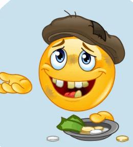 На изображении представлен смайлик, стилизованный под нищего или попрошайку. У него на голове коричневая кепка с заплаткой, а лицо выражает грусть и надежду одновременно. Рот смайлика широко открыт в улыбке, но видно, что у него не хватает нескольких зубов, а остальные кривые и с пятнами. Внизу изображения смайлик держит серую тарелку, в которой лежат несколько монет и мятая зеленая купюра, символизирующая деньги. Рядом с тарелкой на светлом фоне также разбросаны отдельные монетки. Общий вид смайлика создает образ человека, который просит милостыню.