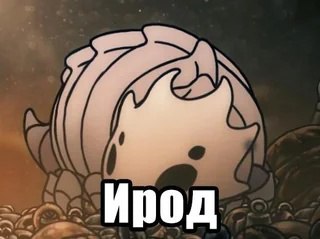 На картинке изображен Bell beast из игры Silksong (или похожий на него персонаж из мира Hollow Knight) с большой надписью "Ирод" на переднем плане. Существо выглядит немного меланхолично или устало, что придает мему дополнительный оттенок. Фон напоминает детализированные локации из игр серии, создавая атмосферу загадочного мира. Пользователи часто ищут это изображение по слову "Ирод", так как оно является главной частью шутки, а также по названию "Bell beast".