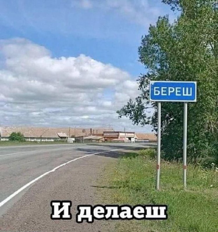 На изображении показан дорожный указатель синего цвета с надписью "Береш", который стоит на фоне сельской местности, деревьев и дороги. Надпись "И делаешь" черными буквами в белой обводке расположена под указателем. Вероятно, это шутка, основанная на игре слов "Берешь и делаешь" (что означает "берешь и делаешь", или "просто сделай это"), где "Береш" - это название населенного пункта.