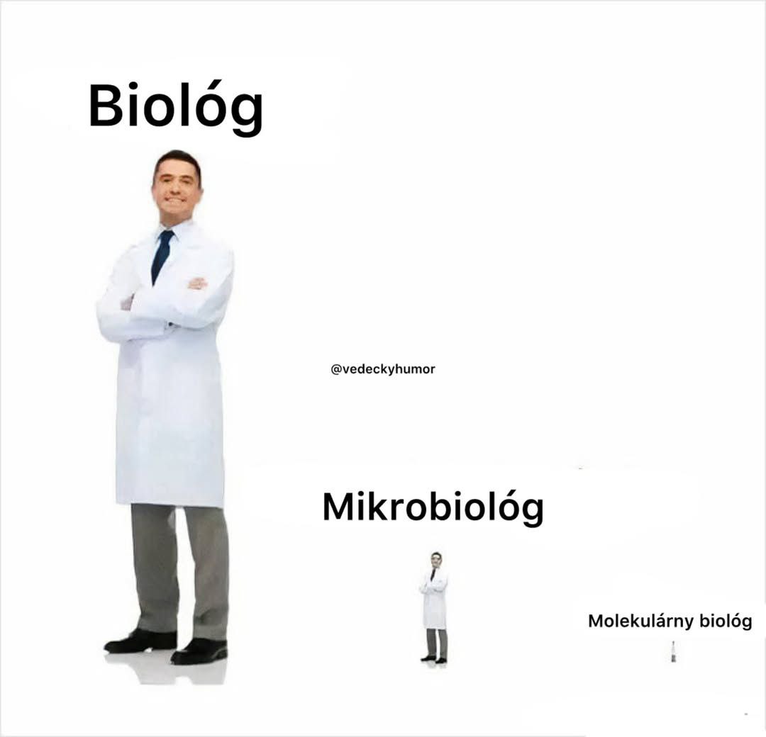 На изображении представлен юмористический мем, иллюстрирующий разницу между биологом, микробиологом и молекулярным биологом. Слева находится крупное изображение мужчины в белом халате, над которым написано «Биолог». Далее, правее и значительно меньше, изображен точно такой же мужчина в халате с надписью «Микробиолог». И, наконец, справа внизу, едва заметное изображение того же мужчины, но еще меньше, подписано как «Молекулярный биолог». Этот мем играет на том, что чем глубже и меньше по размеру объекты изучения в биологии, тем «меньше» кажется сам ученый, который ими занимается. Это забавное визуальное сравнение подчеркивает специализацию и масштабы исследования в различных областях биологии.