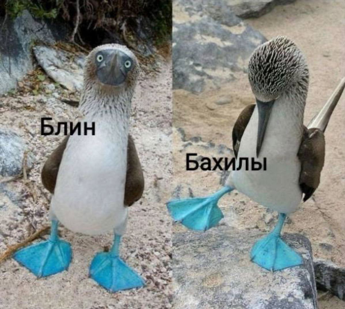 На изображении показана голубоногая олуша, разделённая на две части. На левой стороне птица стоит прямо, её голова смотрит вперёд, а её большие синие лапы выглядят как блинчики. Сверху написано слово "Блин". На правой стороне олуша наклонилась, демонстрируя свои лапы, которые напоминают бахилы. Сверху над ней написано слово "Бахилы". Мем "Блин и бахилы" обыгрывает забавное сходство между лапами голубоногой олуши и двумя совершенно разными предметами. В левой части лапы птицы сравниваются с блинами, благодаря их плоской и круглой форме, а в правой части – с медицинскими бахилами, из-за их характерного синего цвета и формы, которая "облегает" лапу. Это создаёт комический эффект, основанный на визуальной ассоциации.