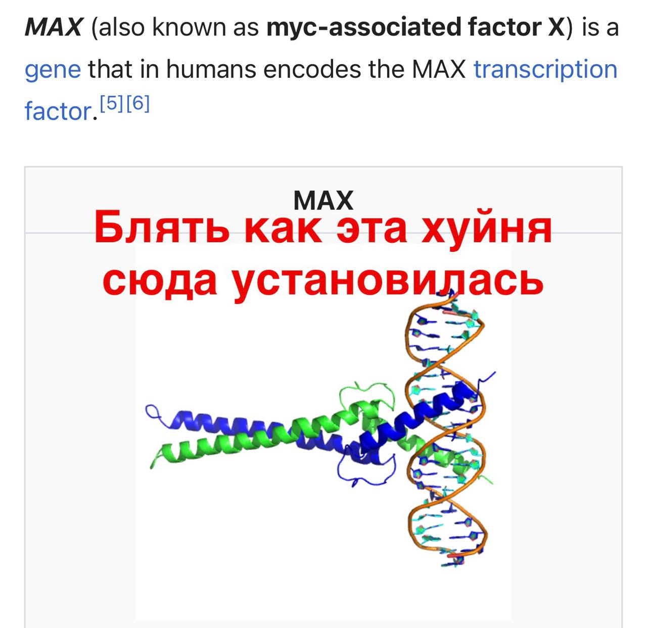 На изображении представлен скриншот страницы Википедии, посвященной гену MAX. В верхней части экрана видно определение гена MAX (myc-associated factor X), который кодирует фактор транскрипции у человека. Ниже, на белом фоне, изображена сложная молекулярная структура, предположительно, связанная с этим геном, и крупным красным шрифтом написана фраза: "Блять как эта хуйня сюда установилась", а над ней также черным шрифтом написано "MAX". Этот мем иронизирует над сложностью и запутанностью генетических и биологических процессов, которые даже сами гены (в данном случае, ген MAX), кажется, не понимают. Фраза "Блять как эта хуйня сюда установилась" отражает недоумение и, возможно, отчаяние от непонятной и неожиданной ситуации, что придает мему юмористический оттенок.