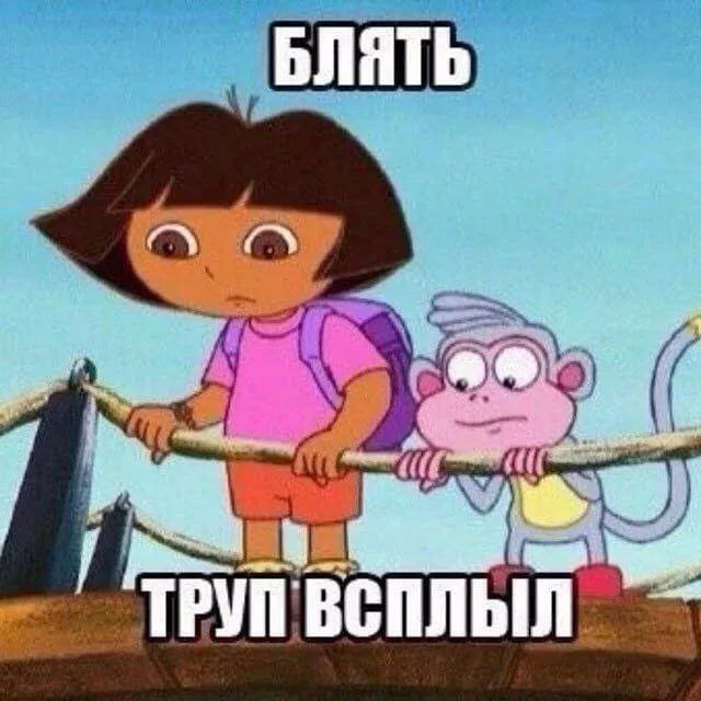 На изображении мы видим Дору-путешественницу и обезьянку по имени Башмачок. Они стоят на каком-то мостике или бревне, перекинутом через водное пространство, судя по сине-голубому фону, напоминающему воду. Дора с фиолетовым рюкзаком и в розовой футболке, оранжевых шортах и желтых носочках, смотрит вдаль с выражением легкого испуга или недоумения. Рядом с ней стоит Башмачок, маленькая розовая обезьянка с большими глазами, которая тоже выглядит озадаченной или испуганной, цепляясь за перекладину. Над Дорой надпись «Блять», а под ними, в нижней части изображения, надпись «Труп всплыл». Эти надписи придают невинному мультяшному сюжету мрачный и шокирующий смысл, создавая комический эффект контраста между детскими персонажами и взрослым, шокирующим содержанием.